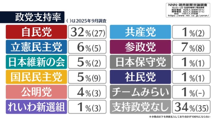読売新聞の政党支持率調査、国民民主の支持率が9%から5%に急落