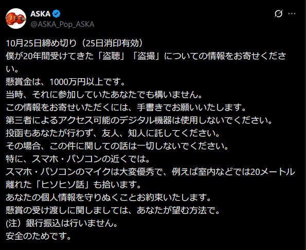 懸賞金1000万円以上 ASKA、20年間受けてきた「盗聴」「盗撮」についての情報締め切り迫る