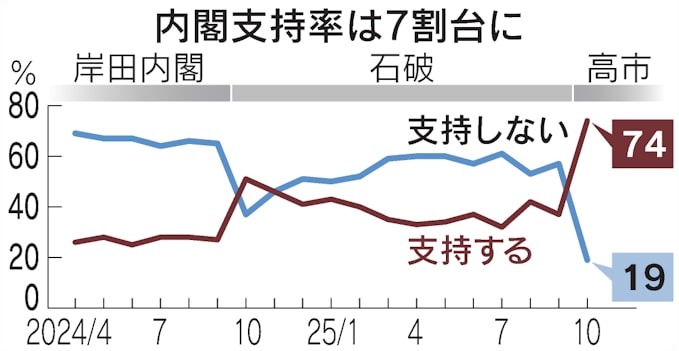 高市内閣の支持率74% 39歳以下・40代・50代の8割が支持 国民民主・参政党の支持者も吸収