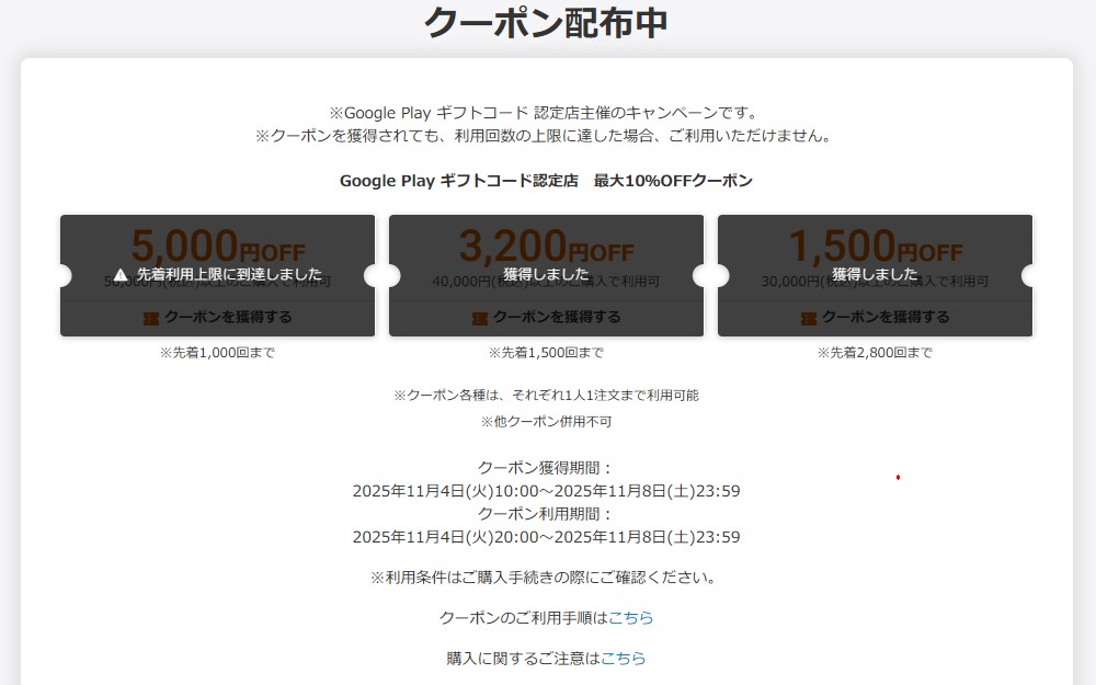 楽天市場、Googleギフトコード5%~10%オフクーポン配布 3万円以上購入で利用可能