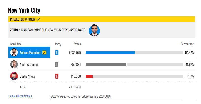 【速報】ニューヨーク市長に初のイスラム教徒 ゾーラン・マムダニ氏(34)が当選確実とアメリカ一部メディア報じる