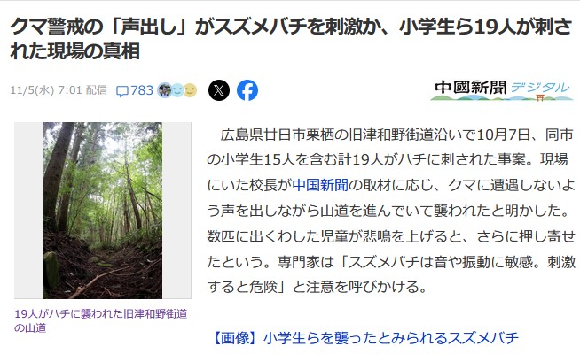 クマ警戒の「声出し」がスズメバチを刺激か、小学生ら19人が刺された
