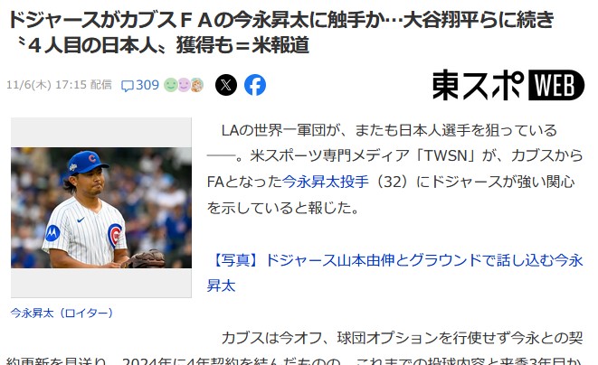 カブスFAの今永、ドジャースが獲得かwwwwwwww