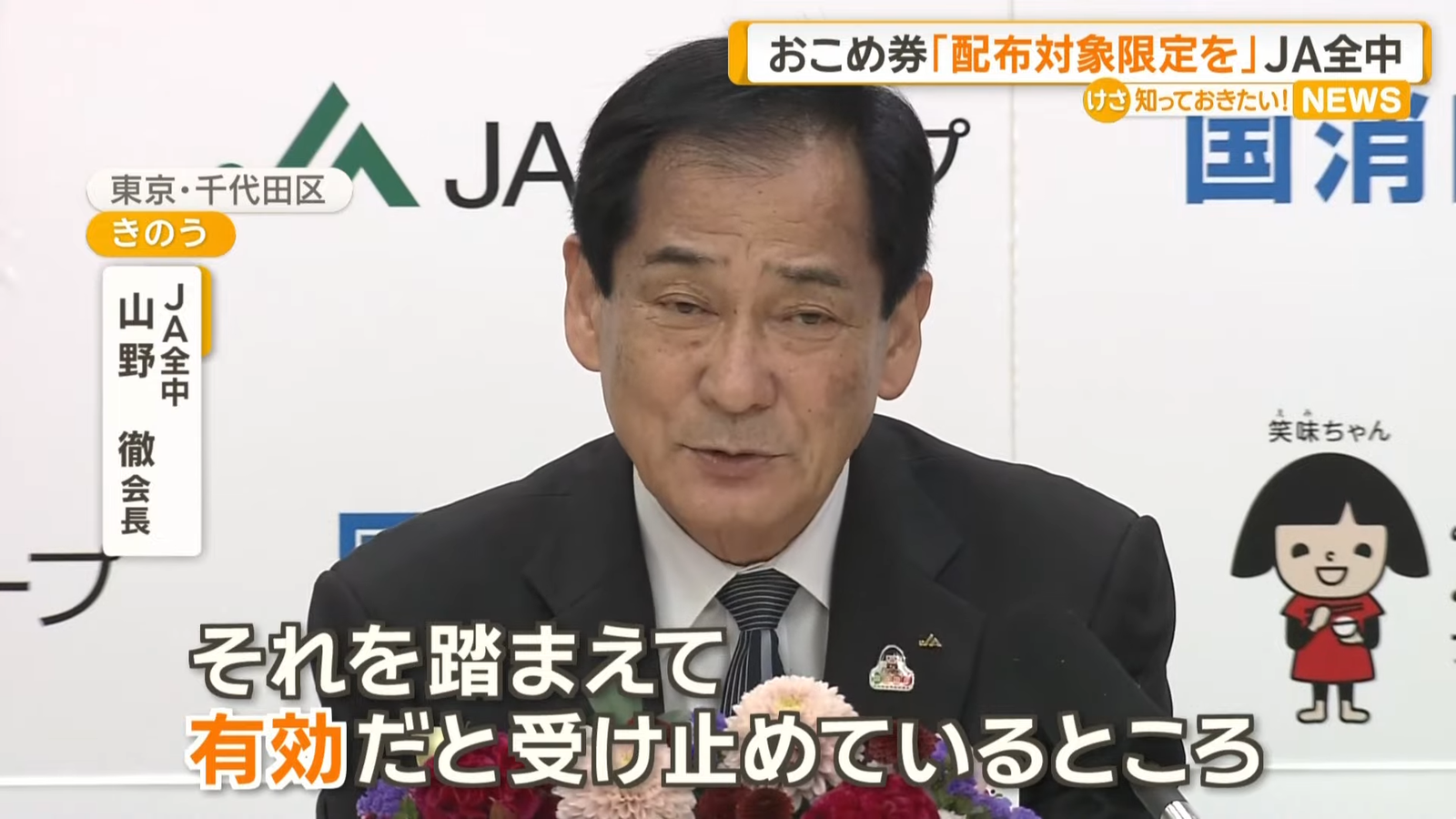 JA全中の山野会長「おコメ券は有効な手段」「配布は対象者を限定する必要ある」