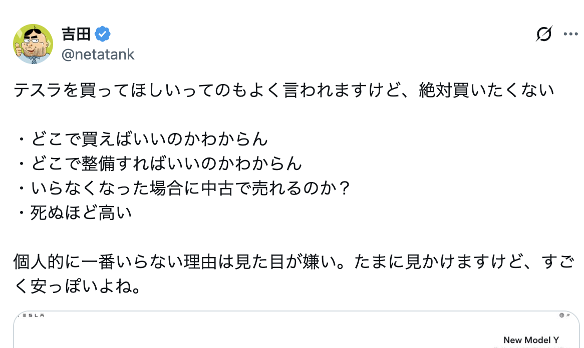 テスラを買ってほしいってのもよく言われますけど、絶対買いたくない