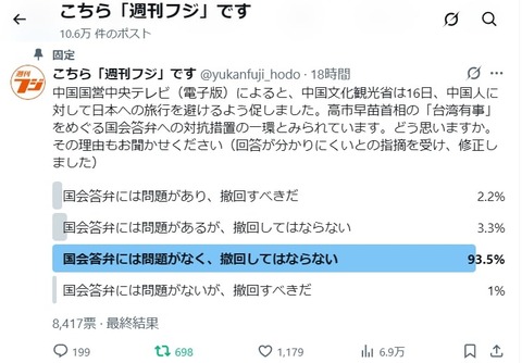 日本人の93.5%「高市首相の国会答弁は問題がなく、撤回してはならない」