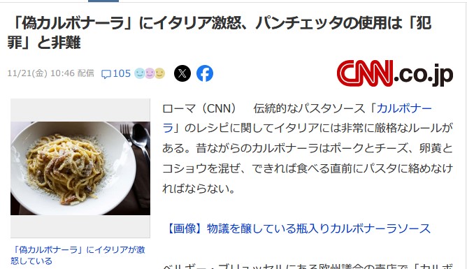 パンチェッタ使用の「偽カルボナーラ」にイタリアぶちギレ イタリアの農相は「料理犯罪」と非難