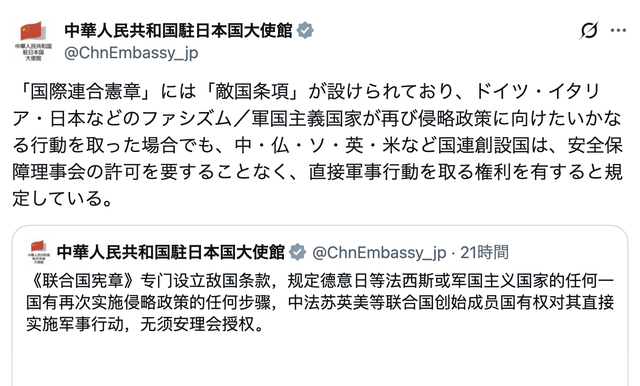 — 中華人民共和国駐日本国大使館 (@ChnEmbassy_jp) November 21, 2025