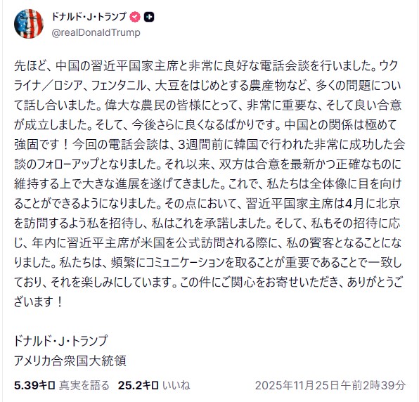トランプ大統領、中国の習近平国家主席が国賓として訪米すると発表「米中関係は極めて強固」 台湾情勢には触れず