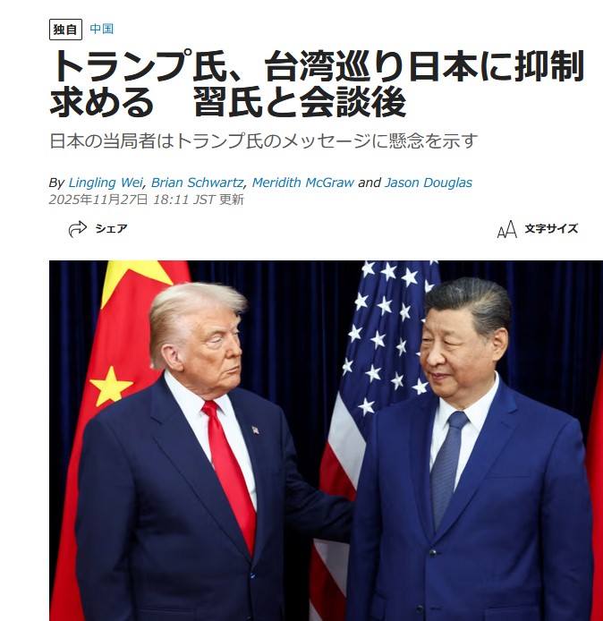 WSJ「トランプ大統領が高市首相に助言。台湾巡り日本に抑制求める」 日本政府「報道は事実ではない」