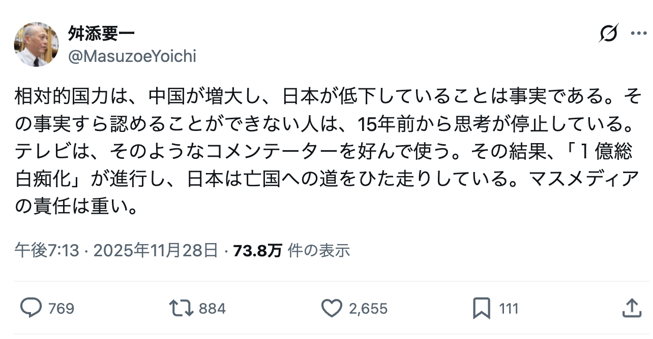 — 舛添要一 (@MasuzoeYoichi) November 28, 2025