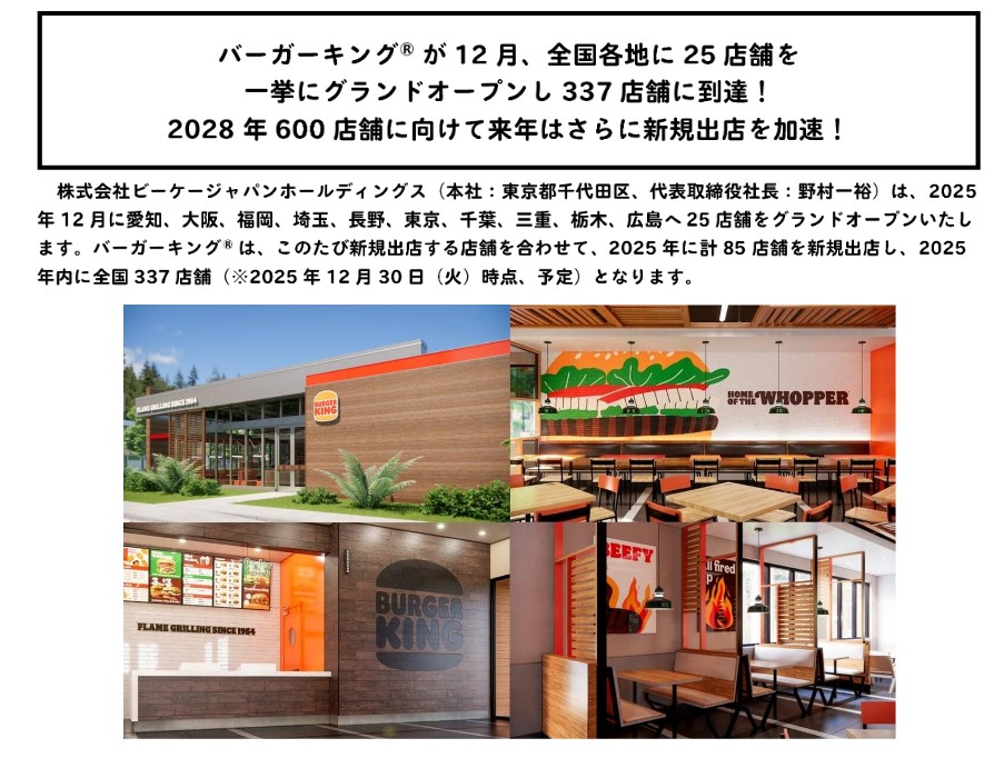 バーガーキング が 12 月、全国各地に 2 5 店舗を一挙にグランドオープンし 337 店舗に到達!2028 年 600 店舗に向けて 来年はさらに新規 出店を加速! 2025年12月に愛知、大阪、福岡、埼玉、長野、東京、千葉、三重、栃木、 広島へ 2 5 店舗をグランドオープンいたします。