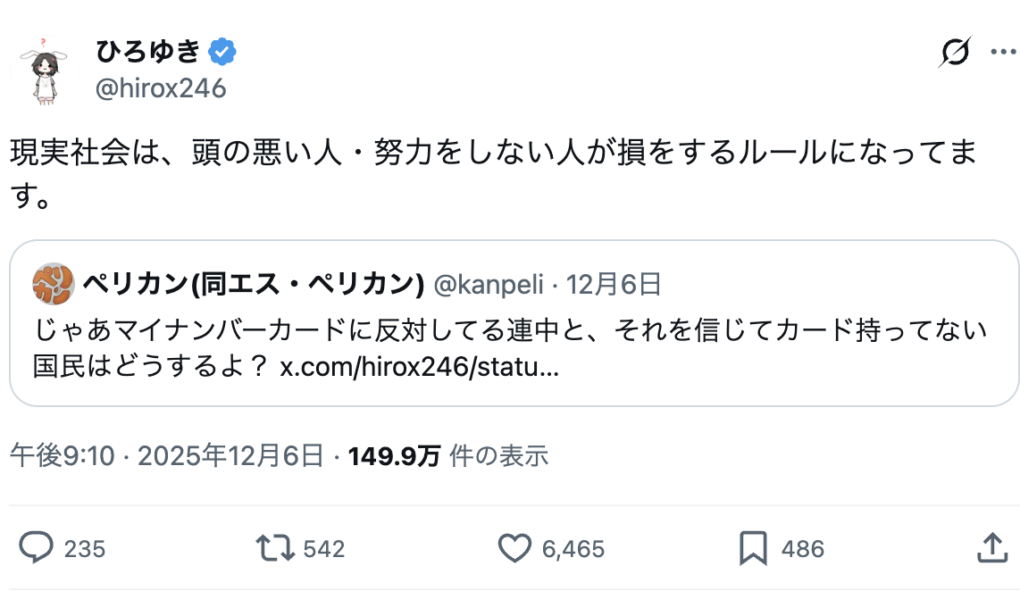 【正論】ひろゆき、マイナンバーカードに反対してる連中に言及「現実社会は、頭の悪い人・努力をしない人が損をする」