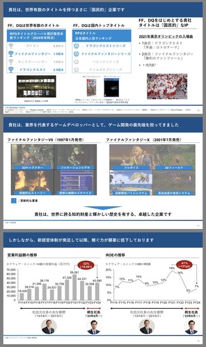 東京–(BUSINESS WIRE)– (ビジネスワイヤ) — 株式会社スクウェア・エニックス・ホールディングス(以下「スクエニHD」)(9684.T)の大株主であるファンドに対して、投資一任業務を提供する3D Investment Partners Pte. Ltd.(「3D」又は「当社」)は、本日、スクエニHDが長年抱えている経営課題を説明したプレゼンテーション資料(以下「本プレゼン資料」)を公開しました。当社は、株主の皆様のご意見を踏まえて、スクエニHDと企業価値向上に向けた建設的な対話を進めて参りたいと考えておりますので、株主の皆様におかれましては、本プレゼン資料をご覧くださいまして、スクエニHDの経営課題について率直なご意見をくださいますようお願い申し上げます。