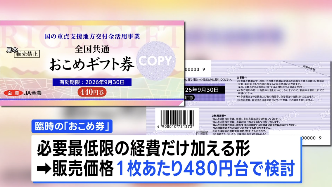 既存のおこめ券は500円で販売され、440円分のコメを購入できる。新たな券では、印刷や配送といった必要経費のみを上乗せして販売価格を引き下げ、購入可能額との差額を圧縮する。販売価格の引き下げ幅は十数円程度になる見通しだ。