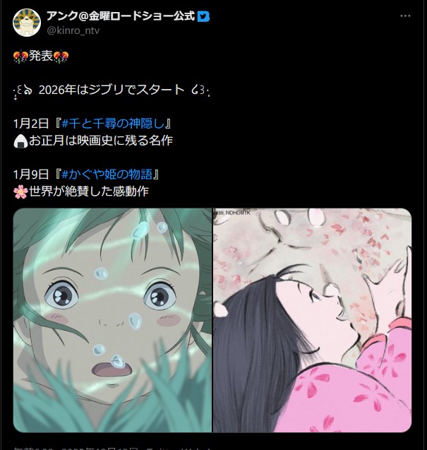 金曜ロードショー、2026年はジブリスタート 1月2日「千と千尋の神隠し」 1月9日「かぐや姫の物語」