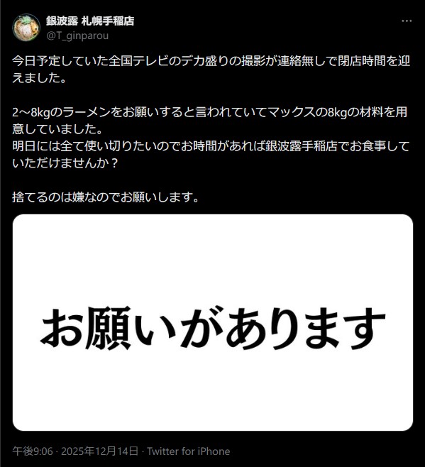 ラーメン店「全国テレビのデカ盛りの撮影が連絡無し閉店時間を迎えた」