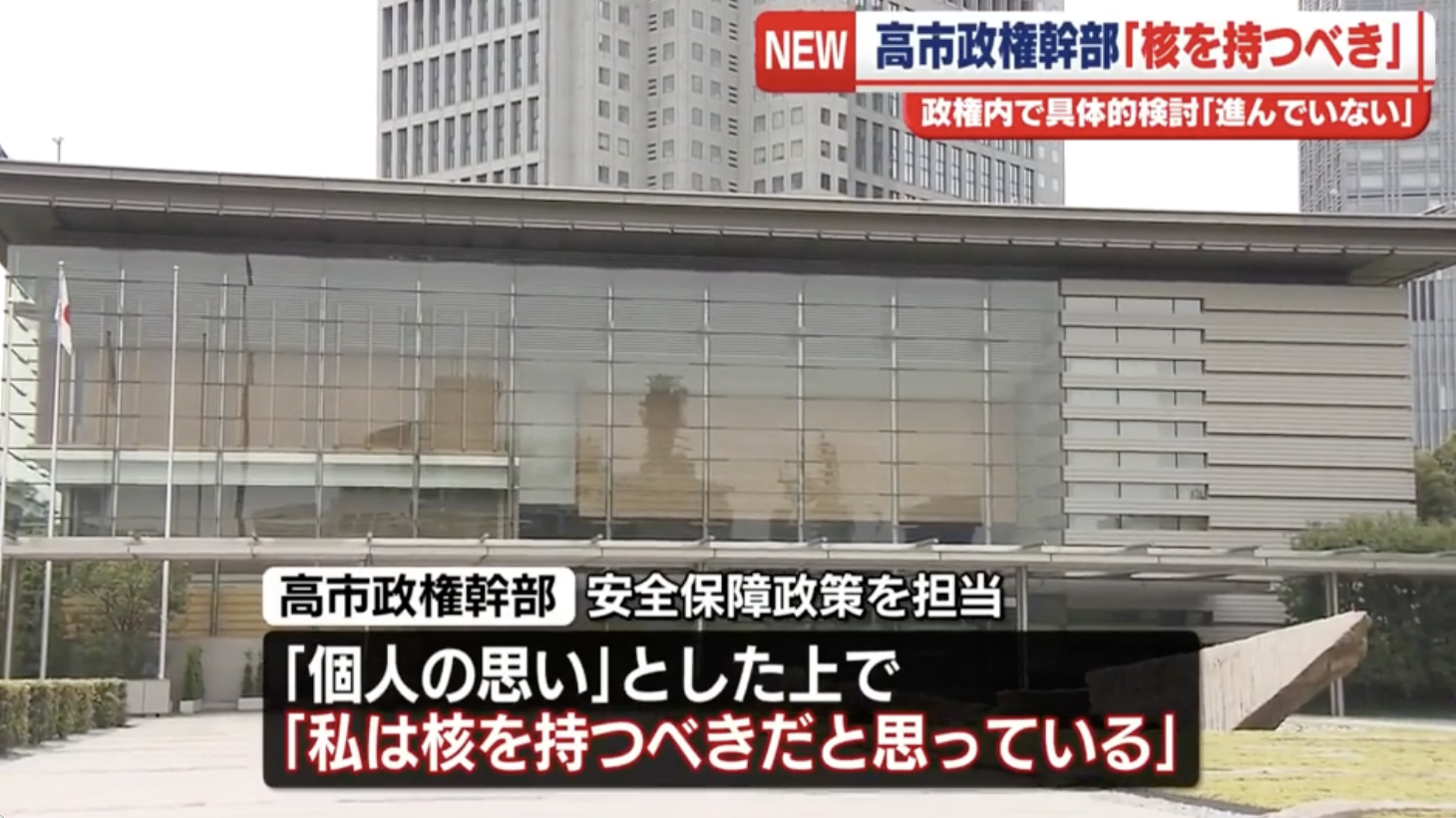 高市政権で安全保障政策を担当する官邸筋は18日、「私は核を持つべきだと思っている」と官邸で記者団に述べ、日本の核兵器保有が必要だとの認識を示した。発言はオフレコを前提にした記者団の非公式取材を受けた際に出た。