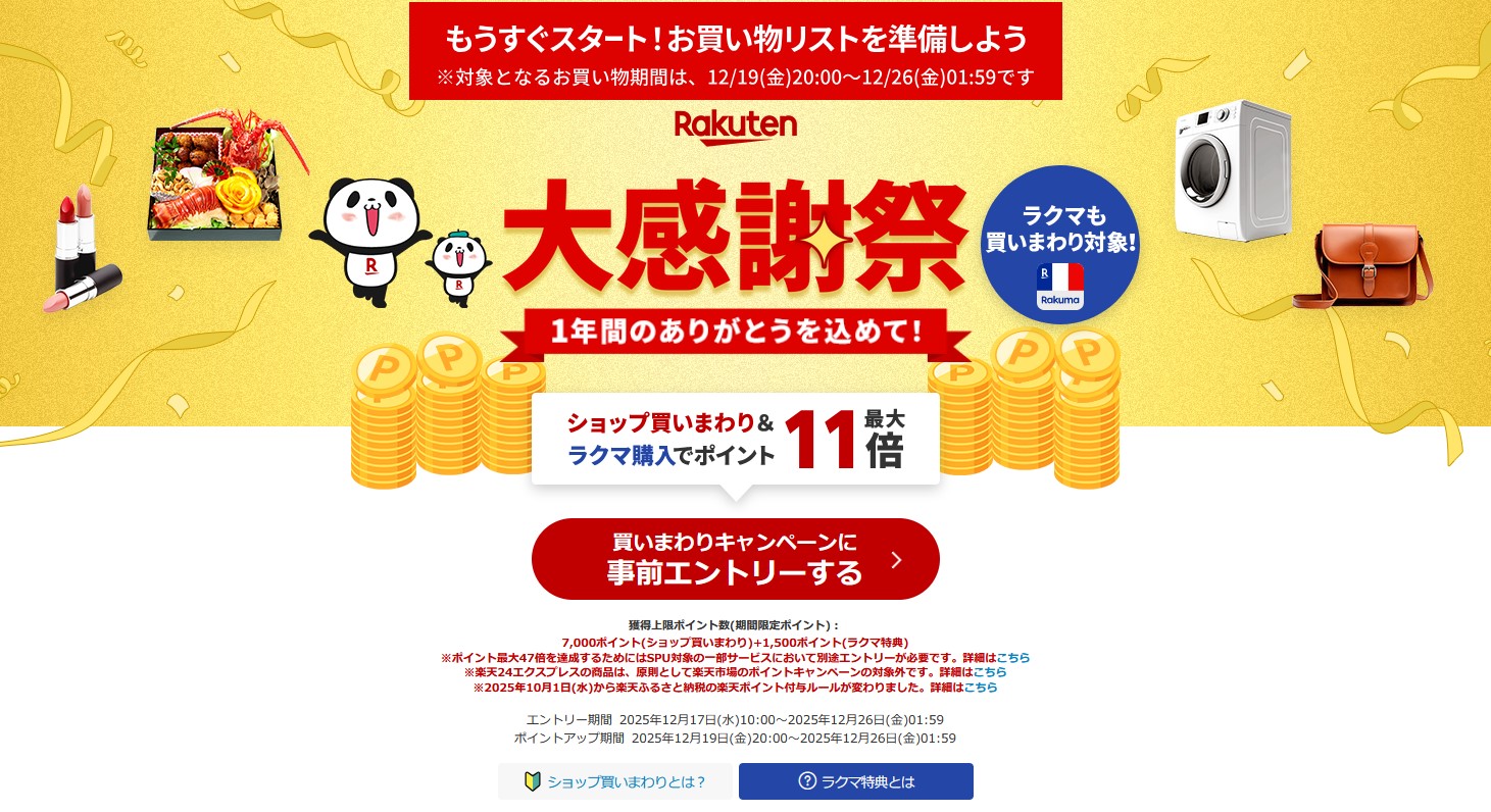 12/19 20:00:00 – 12/26 01:59:59 楽天大感謝祭