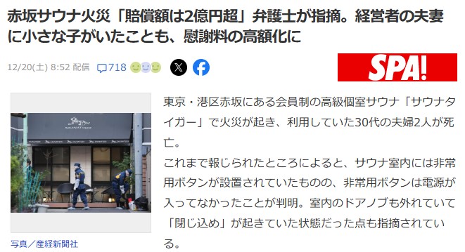 赤坂サウナ火災「賠償額は2億円超」弁護士が指摘。経営者の夫妻に小さな子がいたことも、慰謝料の高額化に
