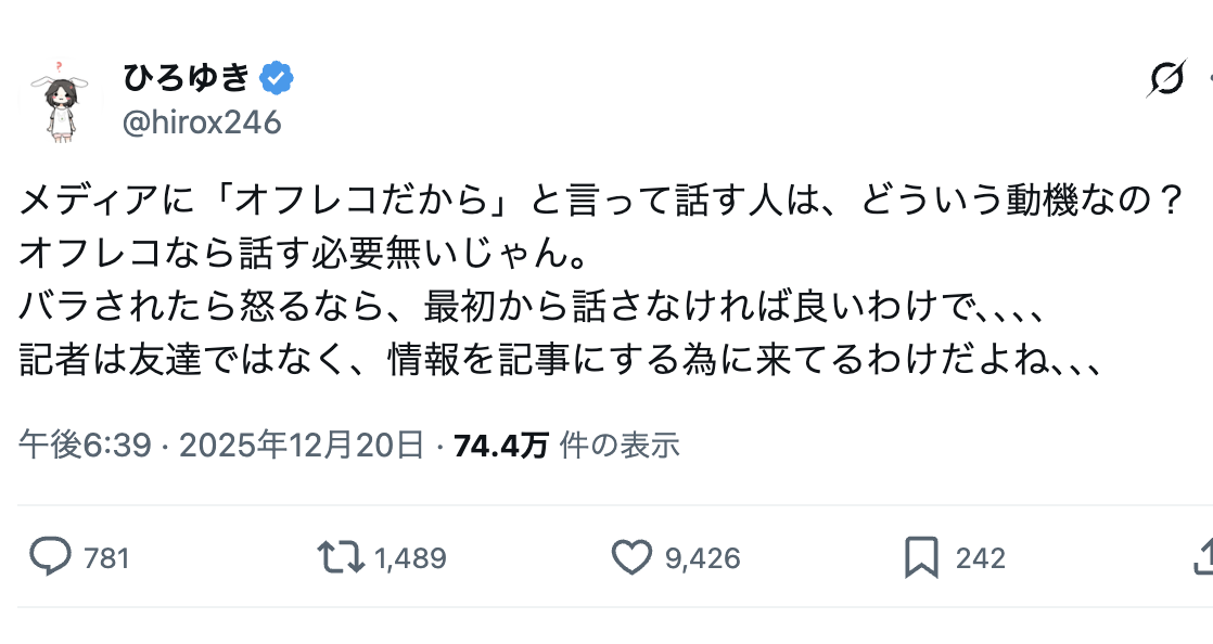 記者は友達ではなく、情報を記事にする為に来てるわけだよね、、、— ひろゆき (@hirox246) December 20, 2025