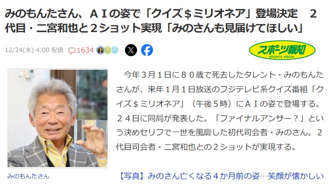 AI姿の「みのもんた」、1月1日の「クイズ$ミリオネア」に登場wwwwwwww