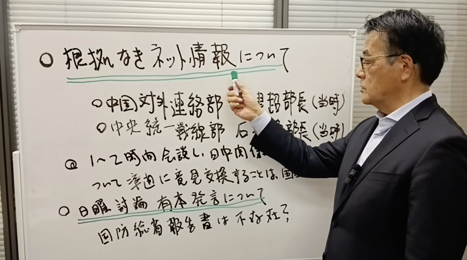 岡田氏は、過去に中国共産党の対外交流部門である中央対外連絡部(中連部)の劉建超部長や対外工作を担う中央統一戦線工作部(統戦部)の石泰峰部長(肩書はいずれも当時)と会談したことをネットで問題視されていると説明。「しかし、2人とも自民党の幹部とも会っている。例えば劉氏は岸田文雄首相とも会っている。石氏は北欧の首相とも会っている」と述べた。