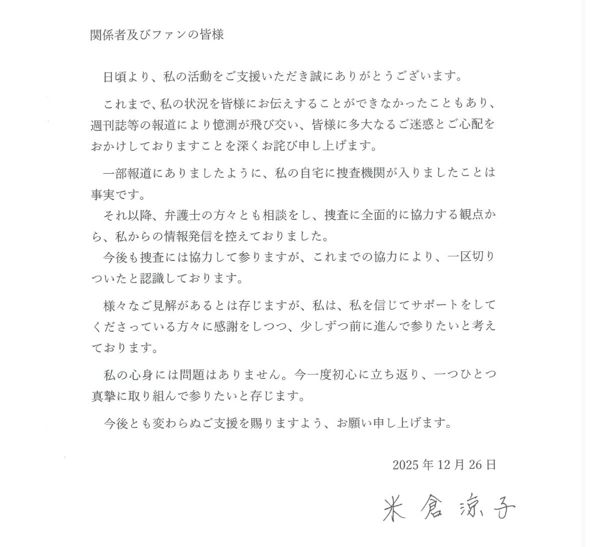 米倉涼子さん、2カ月の沈黙破り声明「自宅に捜査機関入ったのは事実」「一区切りついた」活動再開意欲