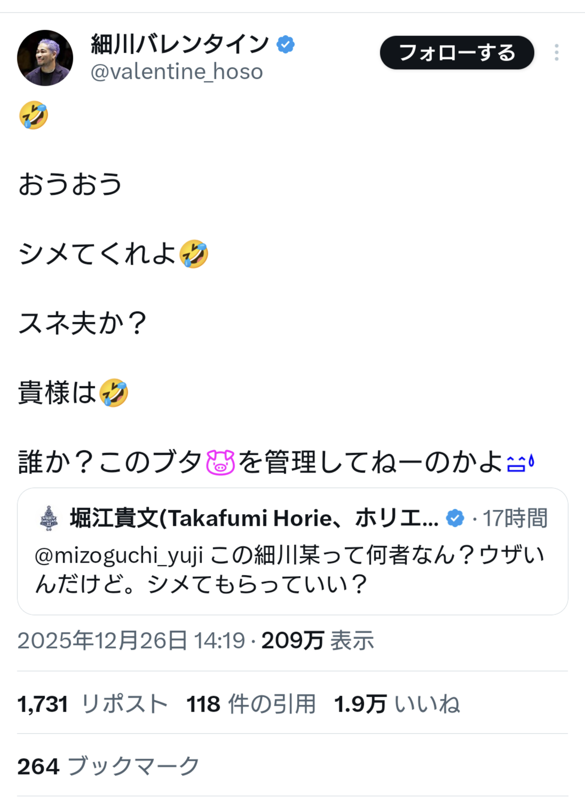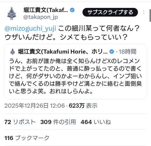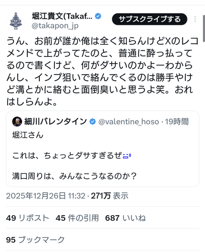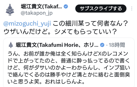 【悲報】細川バレンタインさんと堀江貴文さん、レスバ開始