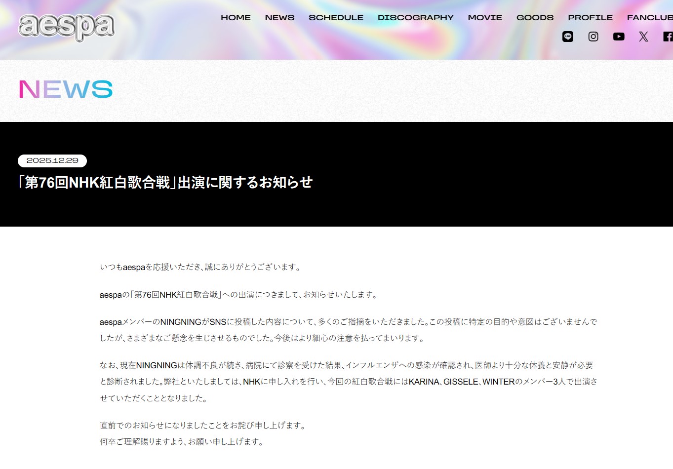 第76回NHK紅白歌合戦に出場予定のaespaは、メンバーのNINGNINGさんの体調不良により、NINGNINGさんを除くメンバー3人で出場することになりました。