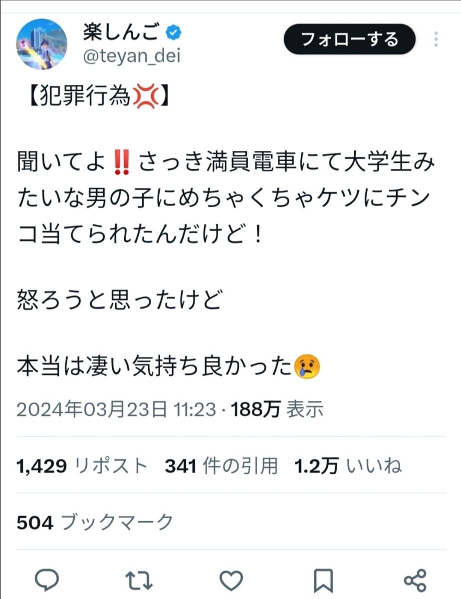 【画像】楽しんご、電車で痴漢に合いブチギレ