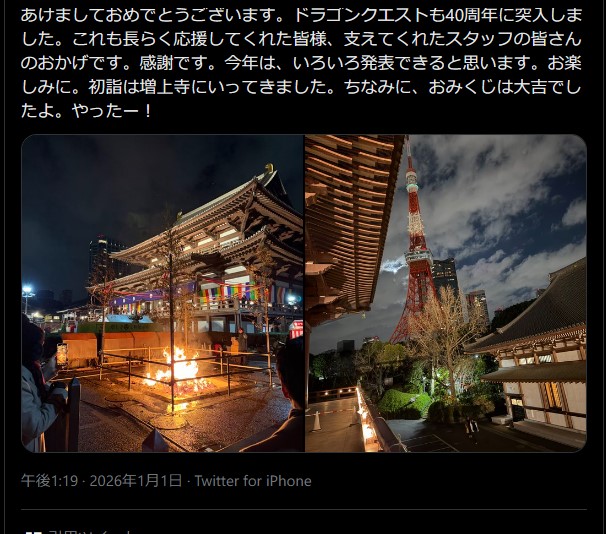 あけましておめでとうございます。ドラゴンクエストも40周年に突入しました。これも長らく応援してくれた皆様、支えてくれたスタッフの皆さんのおかげです。感謝です。今年は、いろいろ発表できると思います。お楽しみに。初詣は増上寺にいってきました。ちなみに、おみくじは大吉でしたよ。やったー!