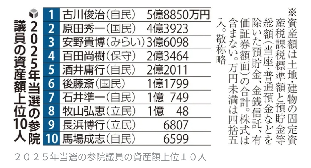 昨夏当選の参院議員平均資産3082万円、トップは自民議員の5億8850万円…1億円超は安野貴博氏や百田尚樹氏ら8人