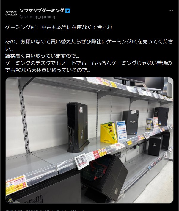 ソフマップ「ゲーミングPC、中古も在庫無い。買い替えたらぜひ売ってください…結構高く買い取っていますので…」