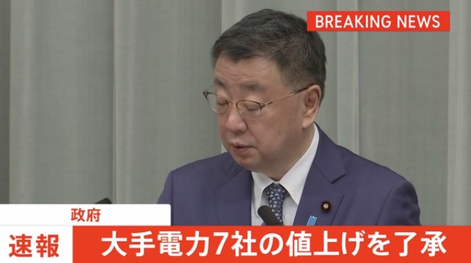【速報】政府、大手電力7社の値上げを了承 松野官房長官が明らかに