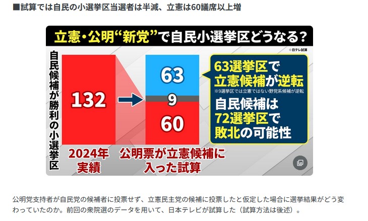 立憲民主・公明の新党で自民党が勝利した小選挙区のうち54~72選挙区で野党候補が逆転する可能性 自民党内「究極の野合だ」