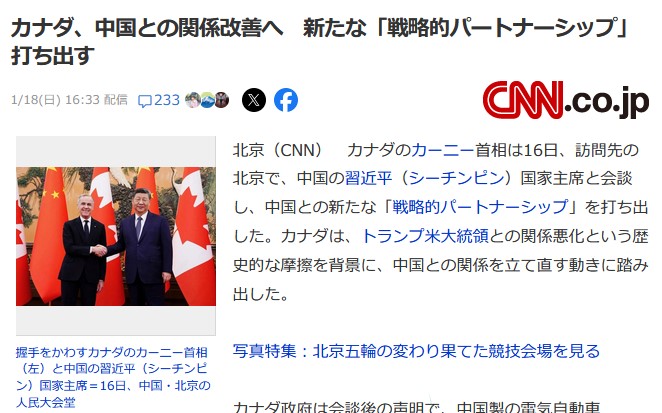 カナダ、中国と新たな「戦略的パートナーシップ」を打ち出す 関係改善へ
