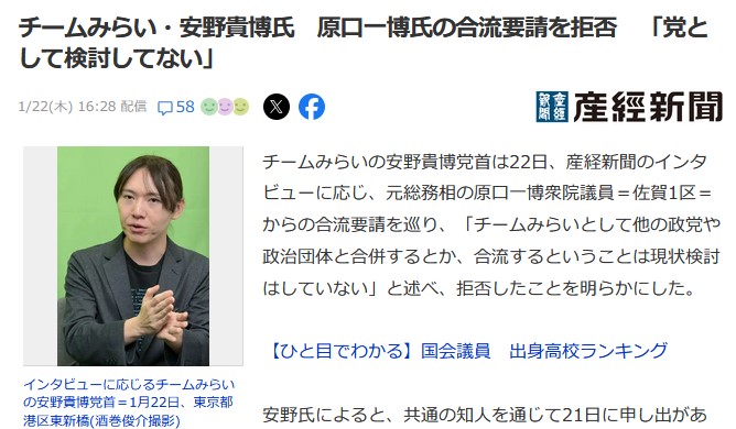 チームみらい・安野貴博氏 原口一博氏の合流要請を拒否 「党として検討してない」