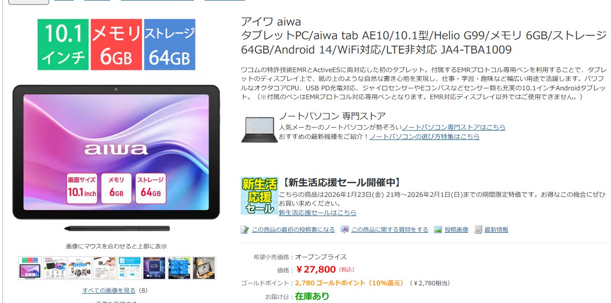 ヨドバシ、7万4800円だったお絵かきタブレット「aiwa tab AE10」を2万7800円(10%ポイント還元)に値下げ