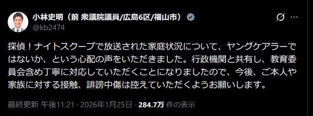 探偵!ナイトスクープで放送された家庭状況について、ヤングケアラーではないか、という心配の声をいただきました。行政機関と共有し、教育委員会含め丁寧に対応していただくことになりましたので、今後、ご本人や家族に対する接触、誹謗中傷は控えていただくようお願いします。