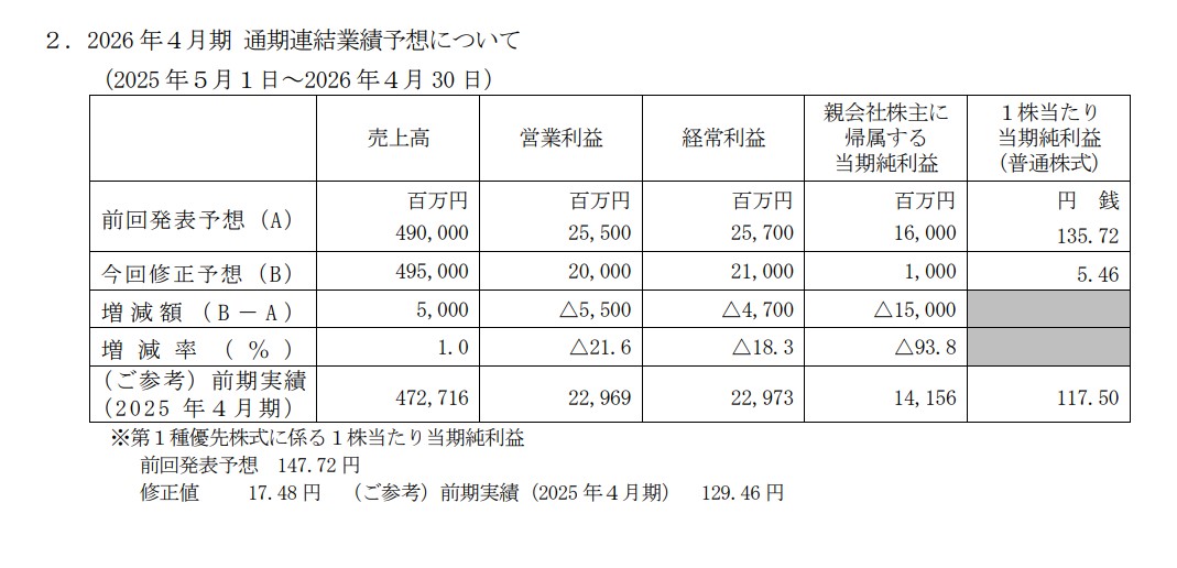 親会社株主に帰属する当期純利益:160億円 → 10億円(▲150億円、▲93.8%)