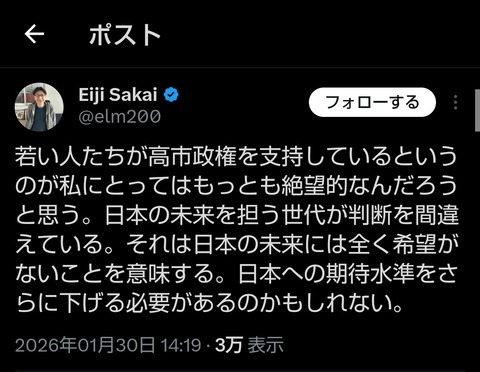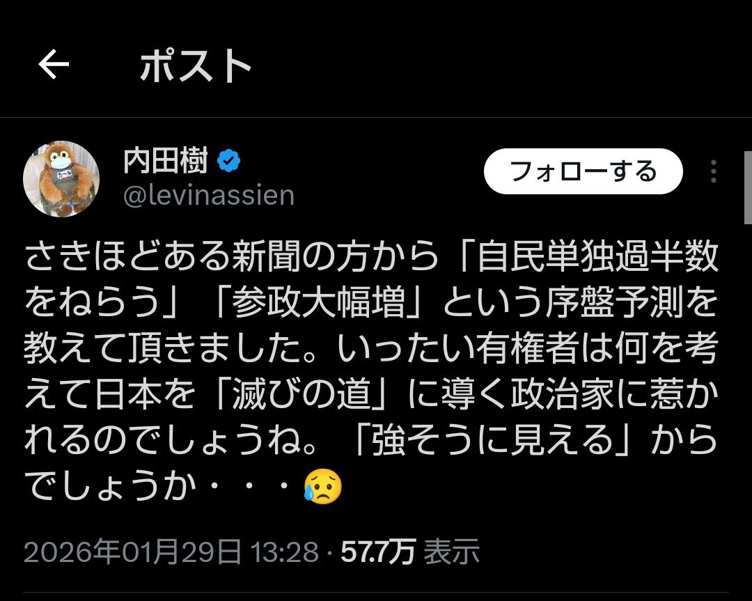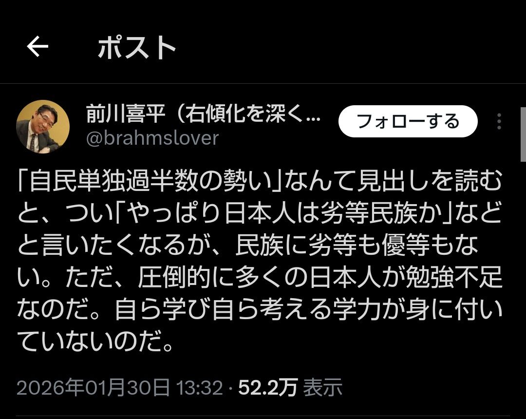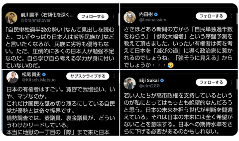 【悲報】リベラル「自民単独過半数の勢い、日本人は劣等民族」「若い人達が高市支持、絶望的」