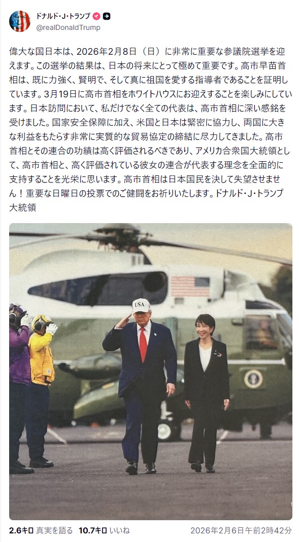 トランプ大統領、衆院選前に高市氏支持を表明「全面的に支持」「彼女は日本国民を決して失望させない」