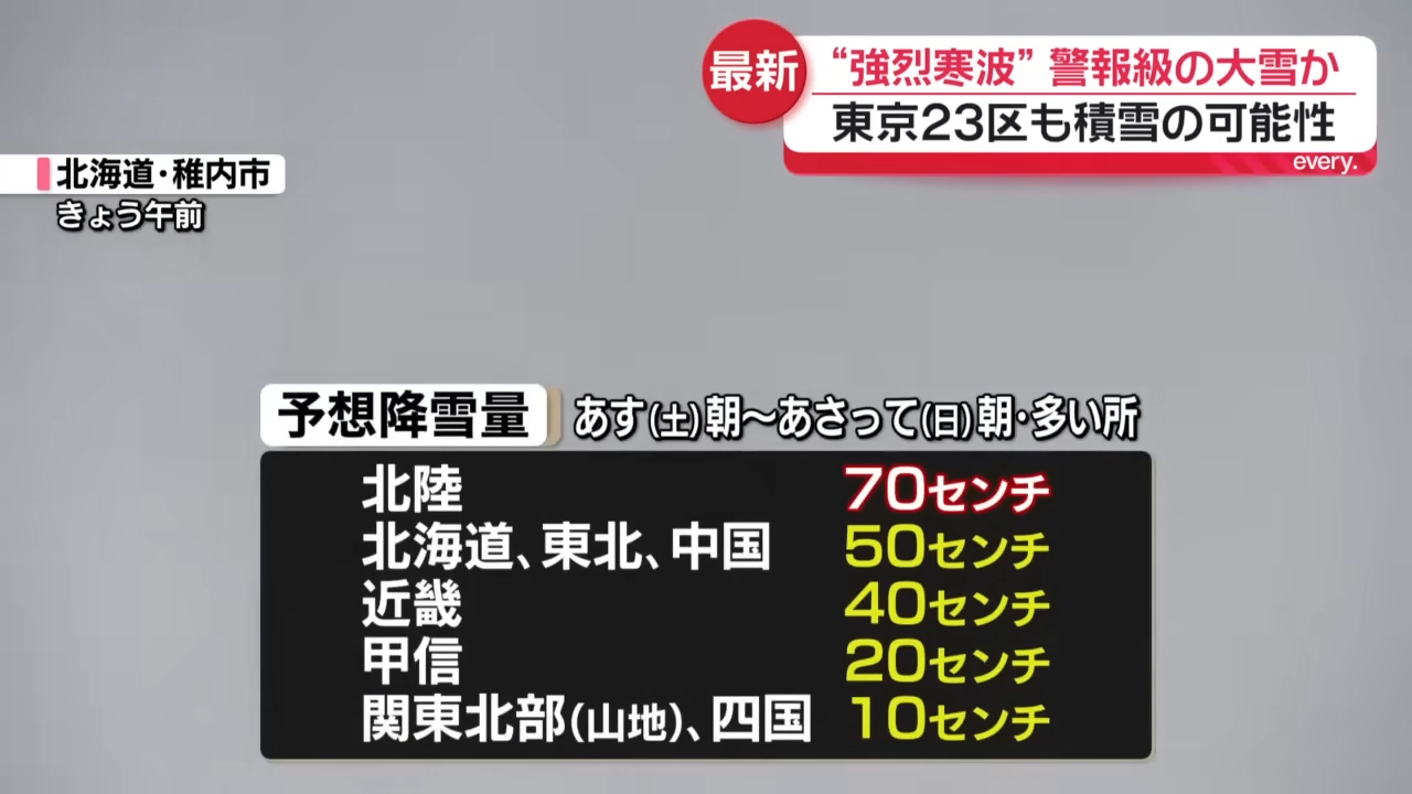 大寒波が再び襲来 予想降雪量は北陸70センチ 北海道・東北・中国50センチ 東京23区でも1センチ
