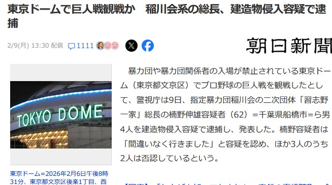 東京ドームで巨人戦観戦か 稲川会系の総長、建造物侵入容疑で逮捕