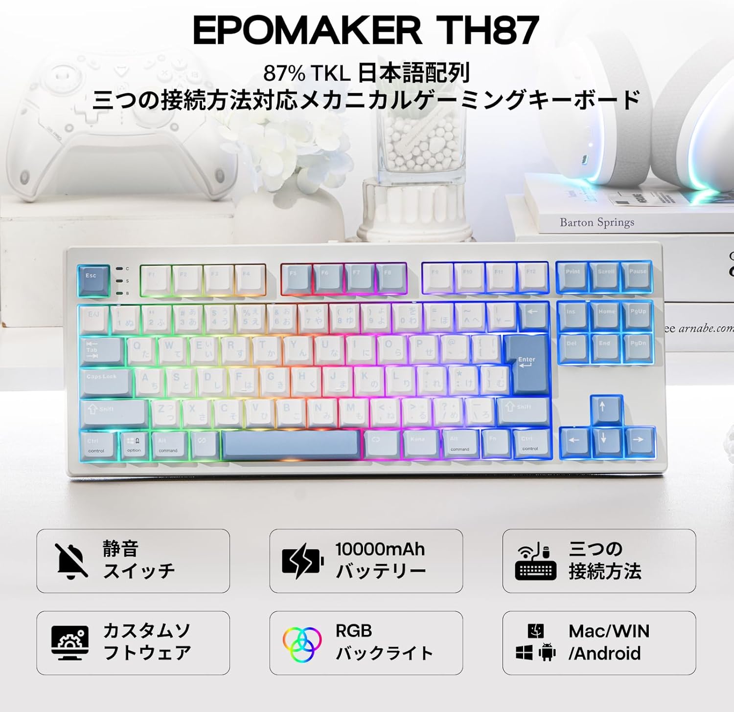 Amazon | EPOMAKER TH87 JIS 日本語配列 TKL ワイヤレスゲーミングキーボード 2.4GHz/BT5.0/有線 テンキーレス ホットスワップ対応 10000mAh 無線 メカニカルキーボード 91キーリニアスイッチ RGBバックライト ガスケット構造 PBTキーキャップ Windows mac対応 (Blue&White, Sea Salt Silent) | EPOMAKER
