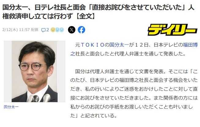 元TOKIOの国分太一、日本テレビの福田博之社長と面会「直接お詫びをさせていただいた」 人権救済申し立ては行わず