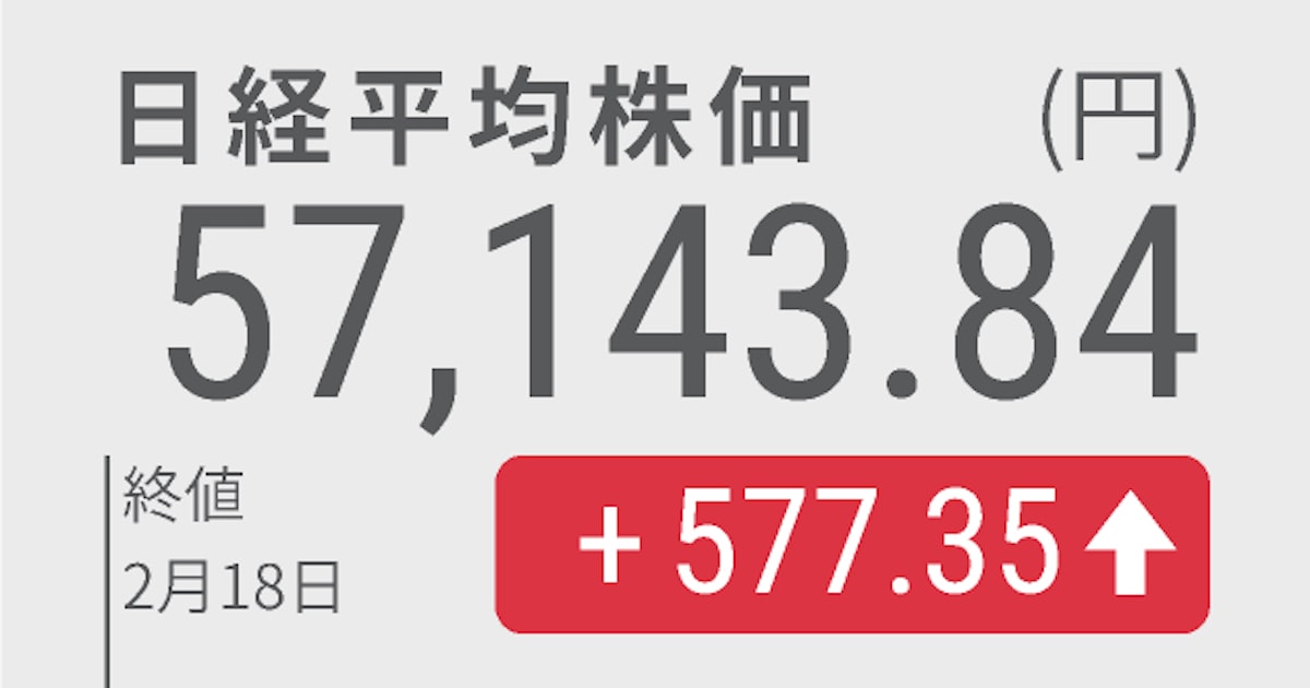 18日の東京株式市場で日経平均株価は5営業日ぶりに反発し、終値は前日比577円(1.02%)高の5万7143円だった。前…