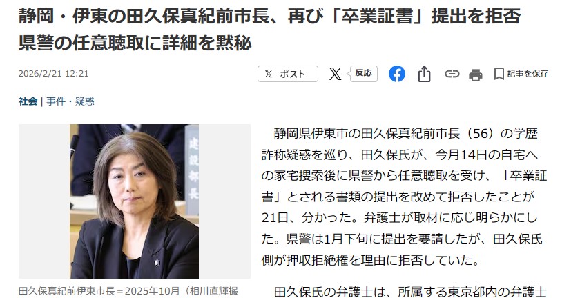 静岡・伊東の田久保真紀前市長、再び「卒業証書」提出を拒否 県警の任意聴取に詳細を黙秘