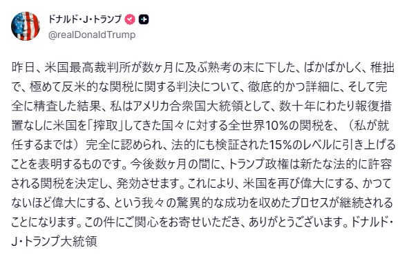 昨日、米国最高裁判所が数ヶ月に及ぶ熟考の末に下した、ばかばかしく、稚拙で、極めて反米的な関税に関する判決について、徹底的かつ詳細に、そして完全に精査した結果、私はアメリカ合衆国大統領として、数十年にわたり報復措置なしに米国を「搾取」してきた国々に対する全世界10%の関税を、(私が就任するまでは)完全に認められ、法的にも検証された15%のレベルに引き上げることを表明するものです。今後数ヶ月の間に、トランプ政権は新たな法的に許容される関税を決定し、発効させます。これにより、米国を再び偉大にする、かつてないほど偉大にする、という我々の驚異的な成功を収めたプロセスが継続されることになります。この件にご関心をお寄せいただき、ありがとうございます。